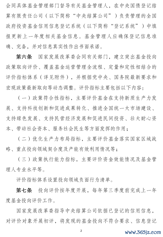 对于出现投向领域负面行为的基金,不予出具投向评价结果,国家发展改革委将有关基金情况通报省级政府、有关部门及相关评价对象,督促有关地方和部门指导基金限期完成问题整改。