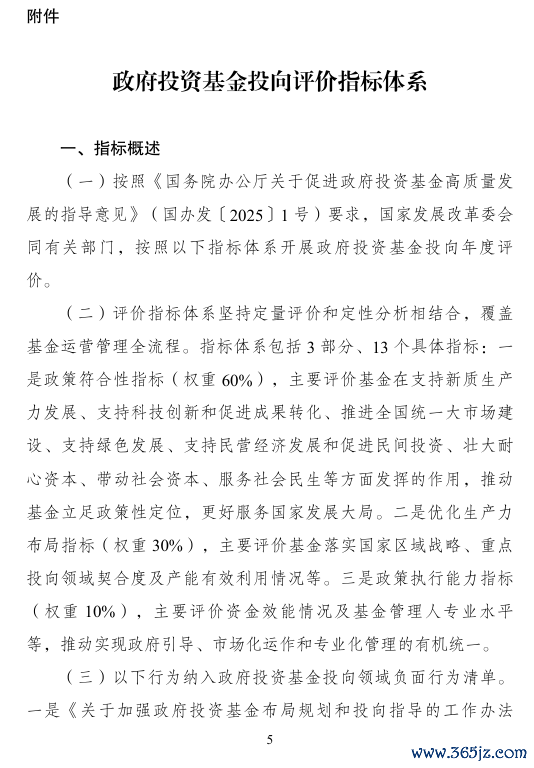 (一)政策符合性指标,主要评价基金在支持新质生产力发展、支持科技创新和促进成果转化、推进全国统一大市场建设、支持绿色发展、支持民营经济发展和促进民间投资、壮大耐心资本、带动社会资本、服务社会民生等方面发挥的作用;