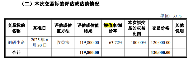 不过,本次交易价格是有溢价的。经收益法评估鑫月配,朗研生命评估基准日股东全部权益评估值为11.98亿元,比审计后合并报表归属于母公司所有者权益增值4.66亿元,增值率63.72%。
